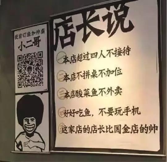太二在年轻人的圈子中被圈粉、被吐槽是因为它的各种奇葩规定,如:四人以上不接待;每日活鱼到店;每天只卖100条;酸菜鱼只做一个味道;不允许加辣不减辣;不外卖;不打折;不拼桌……