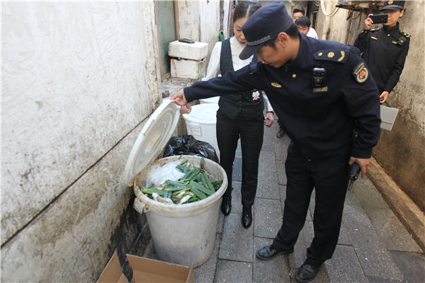10月11日下午,在石景山区时代花园西街的某店,城管队员对餐厅后厨门外的垃圾桶进行仔细的检查。据了解,近期城管部门开展了对餐饮单位餐厨垃圾处理的专项整治,确保餐饮单位将垃圾分类做到位,与正规的餐厨垃圾消纳单位签订合约,避免餐厨垃圾对环境造成破坏,同时保障居民有良好的就餐环境。