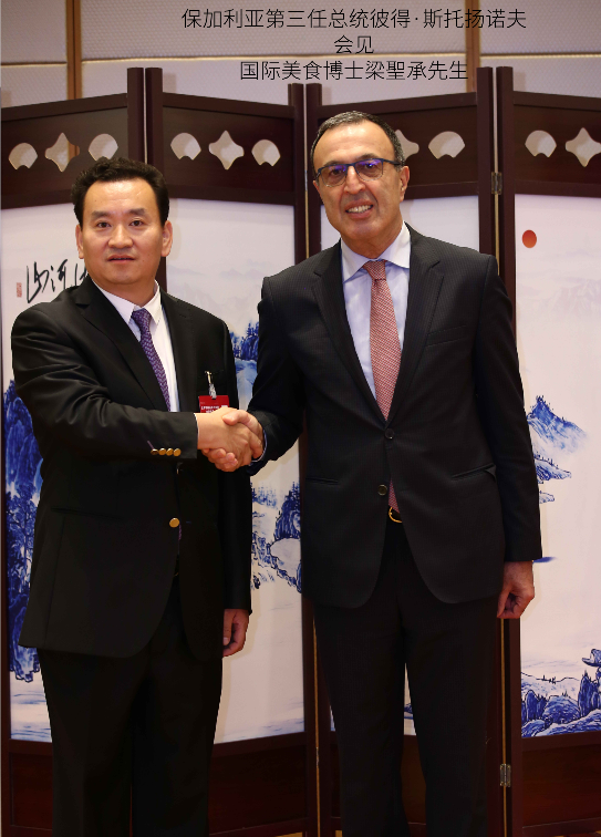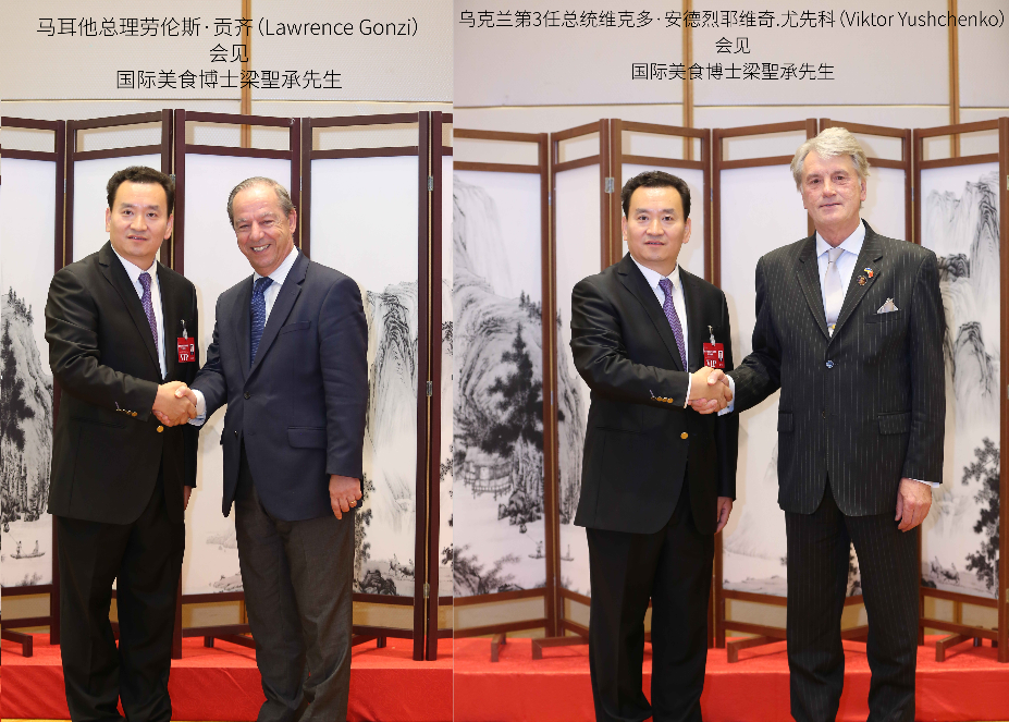 近期知名国际美食博士梁广杰先生应邀参加国际行动理事会访华代表团欢迎晚宴。国际行动理事会利用一些前国家主要领导的经验智慧,以集体形式就当前人类面临政治问题和经济问题向世界主要国家领导提出意见和建议,以便促进国际合作与行动,本次欢迎晚宴国际政要齐聚,规模空前强大,其中有埃及前总理伊萨姆·沙拉夫、乌克兰前总统维克托·尤先科、匈牙利前总理迈杰希·彼德、保加利亚 前总统彼得·斯托扬诺夫、爱尔兰前总理伯蒂·埃亨、波兰前总统科莫罗夫斯基、玻利维亚前总统豪尔赫·基罗、圣马力诺前总统吉安·弗朗哥·泰伦齐、乌拉圭 前总统路易斯·阿尔韦托·拉卡列、斯洛文尼亚前总统达尼洛·图尔克。
