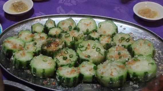 这是一道全素菜。丝瓜切成圈,上面浇上蒜蓉和葱花。整道菜是鲜嫩欲滴啊!!绿色食品。丝瓜的鲜甜之味经过蒸之后,淋漓尽致地挥发了出来。