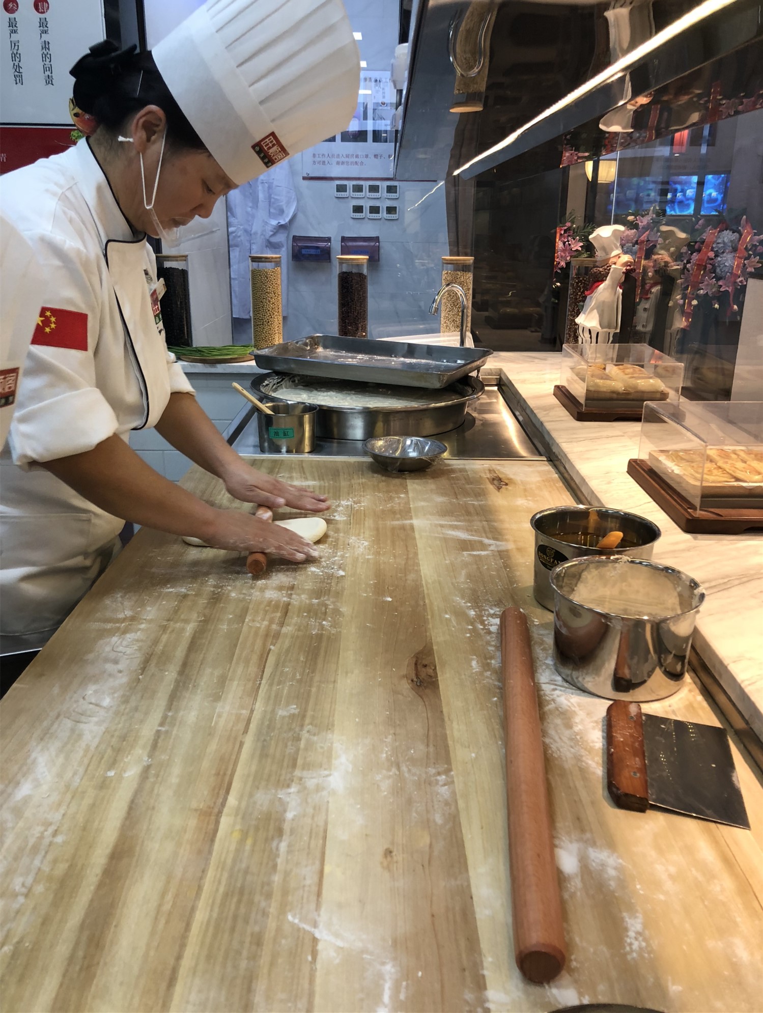 记者获准进入后厨看个究竟,探寻旺顺阁鱼头泡饼的独特配方以及严谨工艺的奥秘,原来,鱼头不腌制,不用添加剂,不过油,而是用有机压榨油炝锅,也不勾芡,以秘汁烧炖,祛除腥味,经过40分钟烹制而成,其色泽红亮,香气扑鼻,诱人垂涎。记者又在明档看到手工烙饼,面粉甄选自内蒙古巴彦淖尔,其昼夜温差大,无霜期长,全年日照时间长达3300小时,每年只产一季优质红硬麦,可媲美美国、加拿大的顶级优质粉。旺顺阁厨师现场烙制,纯手工艺制作,所以外脆内韧。