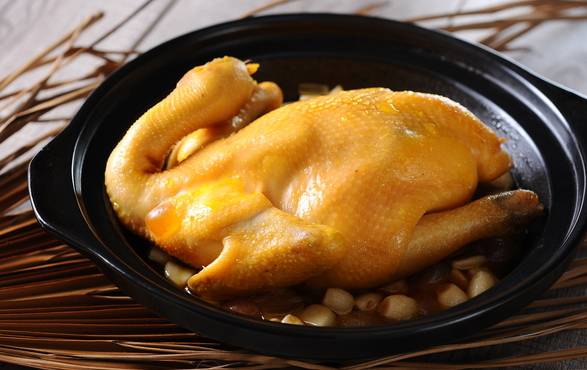 2.熟加工:将高汤1千克投入钢桶中,投入土鸡和蹄花,下入花雕卤汤料调味,加入小香菇、葱段10克,大火烧制,烧开后改小火慢炖1.5小时,土鸡烧好后捞起放入煲中,晾凉后用保鲜膜密封保存。走菜时,将煲入煲仔炉中用小火焖制,收汁,撒葱花2克即可。