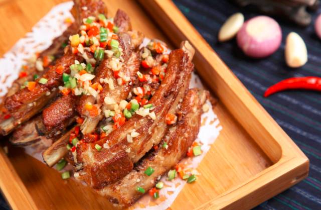 1.客人点菜时,取排骨10根放入烧至六成热的色拉油中,大火炸制7-8秒,捞出控油。