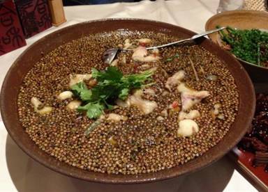 年轻人喜欢的刺激、冲击力强的菜品,在时尚餐厅肯定受欢迎。这道菜所用的青花椒特别多,满满的一大盆,上桌时会给顾客带来震撼。刚刚品尝时,会有点辣,有点涩,吃起来特别过瘾。