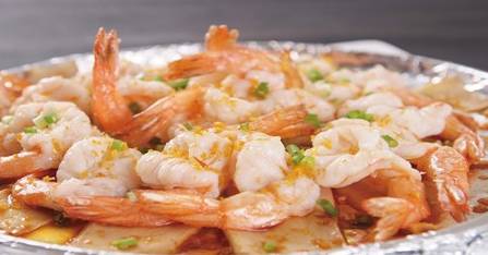 1.客人点菜时,取提前烧烫并铺有锡纸的铁盘一个,先将杏鲍菇一片一片地铺好,然后将生虾肉放入,撒上少许葱花,配特制味汁和卡式炉一起上桌。