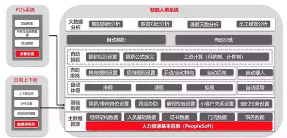 而在基础数据层之上,是应用系统层,包括自动休假、自动排岗、自动算薪、自动离职、自动异动、自动要人、自动返聘。在应用系统层之上,是基于业务操作数据做的大数据分析,实现数字化管理体系。
