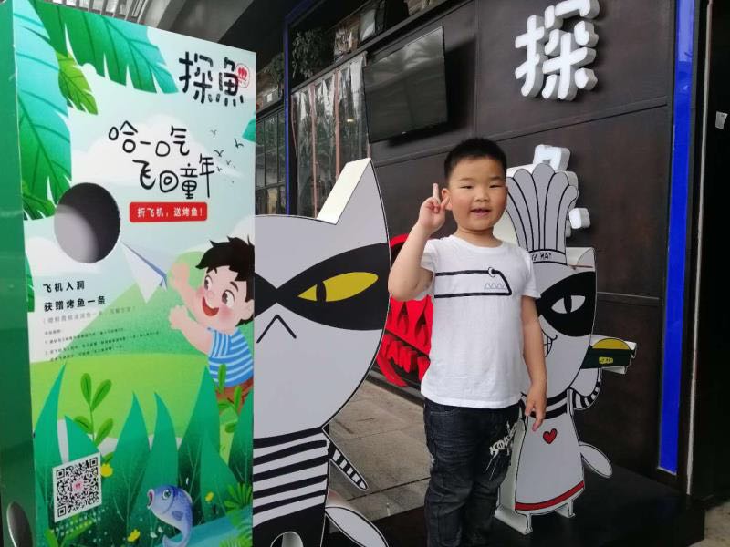 这个六一,探鱼把熟悉的童年游戏带回来了。每个经过餐厅门口的客人,都能免费获得一张环保纸。叠好的纸飞机高高飞出,飞进指定区域,竟能当场获赠一条烤鱼。这么有分量的奖品,顿时吸引了无数来往的过路人群。没有门槛限制的纸飞机活动,上至七十岁老人,下至五岁小孩,都踊跃参与,让这个活动成为六一品牌活动里的最大黑马。