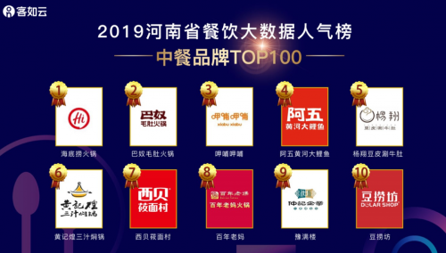 此次“2019河南省餐饮大数据人气榜TOP100”榜单中,海底捞火锅、巴奴毛肚火锅、呷哺呷哺、阿五黄河大鲤鱼、杨翔豆皮涮牛肚、黄记煌三汁焖锅、西贝莜面村、百年老妈、豫满楼、豆捞坊成最受欢迎品牌前十名。