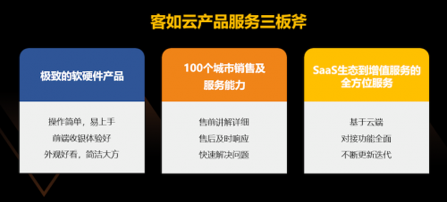 从餐饮行业未来的发展趋势可见,使用餐饮SaaS系统实现智能化经营管理,高效完成点单、外卖、集团化管理、报表、营销等功能已是“势不可挡”,其中客如云凭借其极致的软硬件产品、面向全国100个以上城市的销售和服务网状能力、从SaaS到生态再到增值服务的全业务“三板斧”,成为了餐饮商户选择智能SaaS工具的首选。