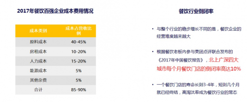 第一是成本上涨,利润空间压缩。中烹协数据显示,2016年全国餐饮百强企业利润率为4.70%,房租高、人力成本高、食材成本高、毛利低的“三高一低”困境,使品牌经营难度增大,餐饮行业倒闭率逐渐攀升。