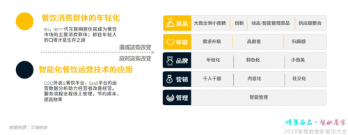 第三是消费习惯的变化。90后的年轻消费者已经成为餐饮行业的主流消费群体,其对于餐厅环境、品牌定位、菜品的要求更高,为了满足年轻消费者不断变化的需求,餐饮商户亟需在智能化、数据化、品牌化、外卖化等多个层面完成变革。