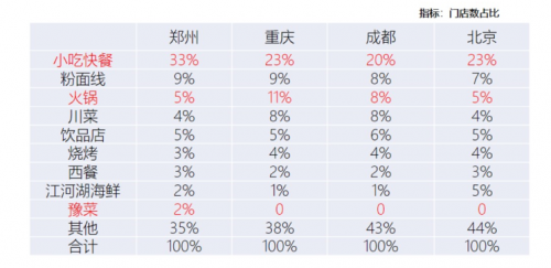 客如云在经过了精准数据分析后发现,河南省的餐饮数据与国内餐饮发展情况及趋势相吻合,就以河南省省会城市郑州来说,截止2018年末郑州市常驻人口1000余万,餐饮商户门店近10万家,市场规模及可提升空间巨大。郑州各业态占比也与整体行业趋势相符,排名前三位的业态为小吃快餐、粉线面、火锅,其中小吃门店数占比高达33%,此数据高于重庆、北京、成都三省市。