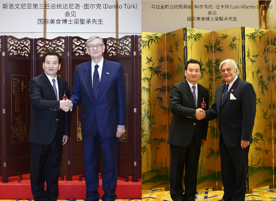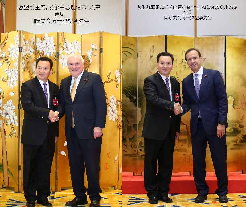近期知名国际美食博士梁广杰先生应邀参加国际行动理事会访华代表团欢迎晚宴。国际行动理事会利用一些前国家主要领导的经验智慧,以集体形式就当前人类面临政治问题和经济问题向世界主要国家领导提出意见和建议,以便促进国际合作与行动,本次欢迎晚宴国际政要齐聚,规模空前强大,其中有埃及前总理伊萨姆·沙拉夫、乌克兰前总统维克托·尤先科、匈牙利前总理迈杰希·彼德、保加利亚 前总统彼得·斯托扬诺夫、爱尔兰前总理伯蒂·埃亨、波兰前总统科莫罗夫斯基、玻利维亚前总统豪尔赫·基罗、圣马力诺前总统吉安·弗朗哥·泰伦齐、乌拉圭 前总统路易斯·阿尔韦托·拉卡列、斯洛文尼亚前总统达尼洛·图尔克。